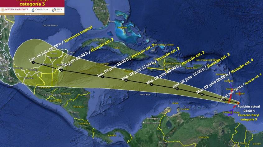 El Servicio Meteorológico Nacional de México informó que, aunque Beryl actualmente no representa un peligro inmediato para el país, se espera que el huracán llegue a la península de Yucatán a finales de esta semana. Según los pronósticos, Beryl podría impactar Quintana Roo, Yucatán y Campeche el viernes, y avanzar hacia Tamaulipas y Veracruz el sábado, ya degradado a tormenta tropical.
