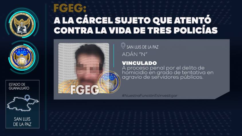ADÁN “N” fue acusado por intentar asesinar a tres elementos de la corporación policiaca encargada de la seguridad pública del municipio de San Luis de la Paz; ante el juez de control, el Agente del Ministerio Público presentó los elementos de prueba obtenidos de la investigación.
