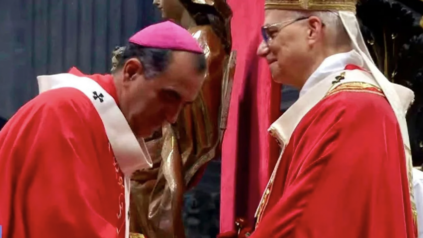 Arzobispo Jaime Calderón recibe el Palio de manos del Papa León XIV en el Vaticano.