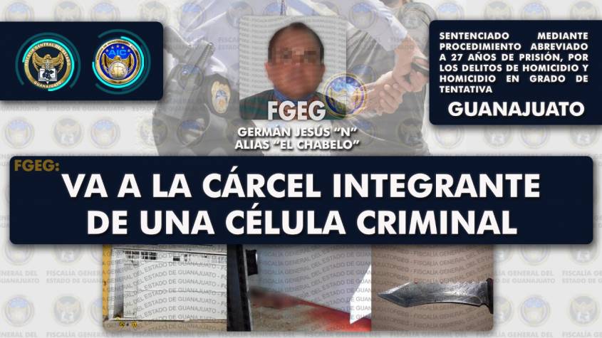 La Fiscalía General del Estado obtuvo que GERMÁN JESÚS “N” alias “El Chabelo” fuera sentenciado tras la rejas, al aceptar su responsabilidad en el homicidio de dos hombres y la tentativa de homicidio de una mujer, ocurridos la madrugada del 29 de julio del año 2021, en Guanajuato capital.
