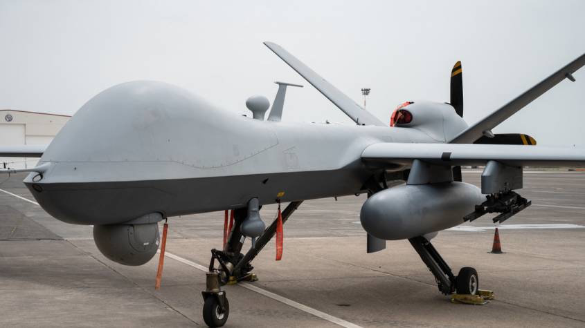 El dron Reaper, fabricado por la compañía estadounidense General Atomics, es una aeronave pilotada a distancia de tipo MALE, media altitud y largo alcance. El aparato está equipado con captadores ultramodernos para poder llevar a cabo operaciones de vigilancia a una velocidad de crucero de 335 km/h. Tiene una envergadura de 20 metros y cuenta con una autonomía de más de 24 horas de vuelo. Puede llevar varios tipos de armamento, como bombas guiadas por láser o por GPS o misiles Hellfire. Su tripulación en tierra está compuesta por cuatro personas que pilotean la aeronave.