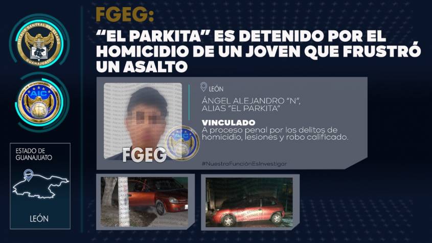 ÁNGEL ALEJANDRO “N” alias “El Parkita”, fue detenido por Agentes de Investigación Criminal, acusado de dispararle a un joven y asesinarlo, cuando este último intervino durante un asalto en el cual el inculpado trató de despojar a una mujer de su celular en el Fraccionamiento El Consuelo, en la ciudad de León.El pasado 10 de septiembre de 2022, alrededor de las 21:10 horas, llegó el inculpado cargando un arma de fuego hasta la calle Del Silencio, donde se encontraban dos de las víctimas, una mujer y un hombre dentro de un vehículo de motor.Repentinamente llegó un sujeto identificado durante la investigación como “El Parkita”, quien a punta de pistola amedrentó a la pareja y haciendo uso de la fuerza forcejeó con la ofendida para intentar desapoderarla de su celular.En ese momento, Juan Carlos “N” llegó para tratar de quitarle el arma de fuego al agresor a lo que se sumó el acompañante de la víctima mujer y entre los dos forcejearon con el inculpado, quien cayó al suelo y en ese momento detonó el arma corta contra el cuerpo del ahora occiso, quien murió de manera súbita.Tras haber asesinado al joven de 23 años de edad y lesionado al otro masculino, ÁNGEL ALEJANDRO “N” huyó del lugar, dejando atrás una escena que hasta la fecha sigue consternando a la población leonesa.Los paramédicos ofrecieron asistencia a las víctimas pero no pudieron hacer nada por Juan Carlos, pues ya no tenía signos vitales.Momentos después Agentes de la Unidad de Homicidios llegaron al lugar e iniciaron las indagatorias para el esclarecimiento del crimen.El agente del Ministerio Público a cargo de la investigación, instruyó al personal pericial para extraer todo tipo de indicios que permitieran determinar la mecánica de los hechos y la identidad del probable responsable.A la par, se realizaron diversas diligencias en lugares estratégicos, donde fue posible obtener información que abonó para acreditar la probable participación de “El Parkita” en la comisión del hecho delictivo.Una vez ubicado el inculpado, elementos de la Unidad Especializada en Mandamientos Judiciales de la Agencia de Investigación Criminal llevaron a cabo un operativo para dar cumplimiento a la orden judicial emitida para su captura.El Juez citó al indiciado y al representante de esta Fiscalía a fin de conocer los datos de prueba integrados en la carpeta de investigación; durante la audiencia, el Agente del Ministerio Público reveló los cargos criminales imputados por el delito de homicidio, lesiones y robo calificado en agravio de los ofendidos y las víctimas indirectas.Para concluir la audiencia, el juzgador resolvió vincular a proceso penal a ÁNGEL ALEJANDRO “N”, e impuso su reclusión como medida cautelar por el tiempo que dure la investigación complementaria.