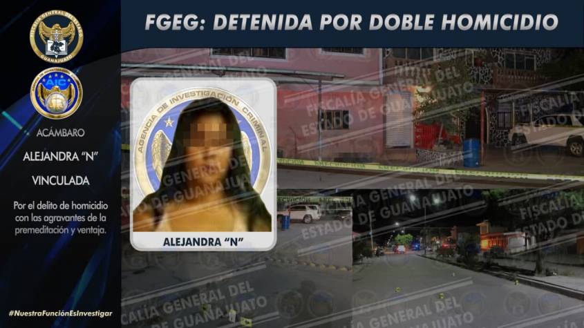 En Acámbaro, la Fiscalía General del Estado arrestó a una mujer cómplice en el asesinato de una supuesta integrante de un grupo delictivo contrario. ALEJANDRA “N” ha sido imputada y vinculada a proceso penal por el delito de homicidio con las agravantes de premeditación y ventaja.