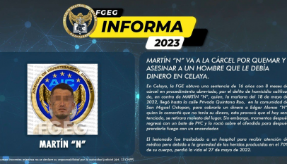 La FGE obtuvo una sentencia de 16 años con 8 meses de cárcel en procedimiento abreviado, por el delito de homicidio calificado, en contra de MARTÍN “N”, que habría quemado a la víctima por una deuda de dinero. La mañana del 18 de mayo de 2022, llegó hasta la calle…
