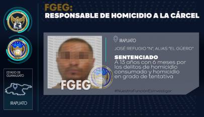 JOSÉ REFUGIO “N”, alias “El Güero” ha sido sentenciado a 13 años con 6 meses de cárcel, por los delitos de homicidio y tentativa de homicidio, en hechos ocurridos en un autolavado ubicado en Paseo Solidaridad, esquina con avenida del Jilguero en la colonia Ciudad de los Olivos, en Irapuato.…