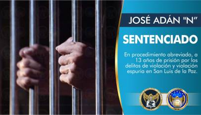La Fiscalía General del Estado obtuvo sentencia condenatoria de 13 años en prisión para José Adán “N”, culpable de los delitos de violación y violación espuria, en agravio de una víctima menor de edad. En San Luis de la Paz, en enero de 2018, estando en un domicilio, el sentenciado…