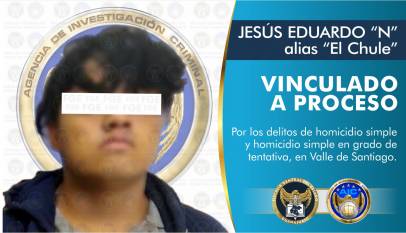 Jesús Eduardo “N” alias “El Chule”, fue detenido en Valle de Santiago, por estar vinculado al asesinato de 4 personas y al intento de homicidio de una quinta víctima. Este sujeto fue vinculado a proceso penal en calidad de autor material en los hechos que la ley señala como delitos…