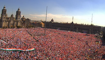 Vistiendo camisas y cachuchas color de rosa, los manifestantes fueron llegando en larguísimas filas por Madero, Pino Suárez, Tacuba, 20 de Noviembre y demás calles que desembocan en la plancha del Zócalo capitalino. Las largas mantas se desplegaban hasta en las terrazas del Hotel Majestic, del Gran Hotel de México…