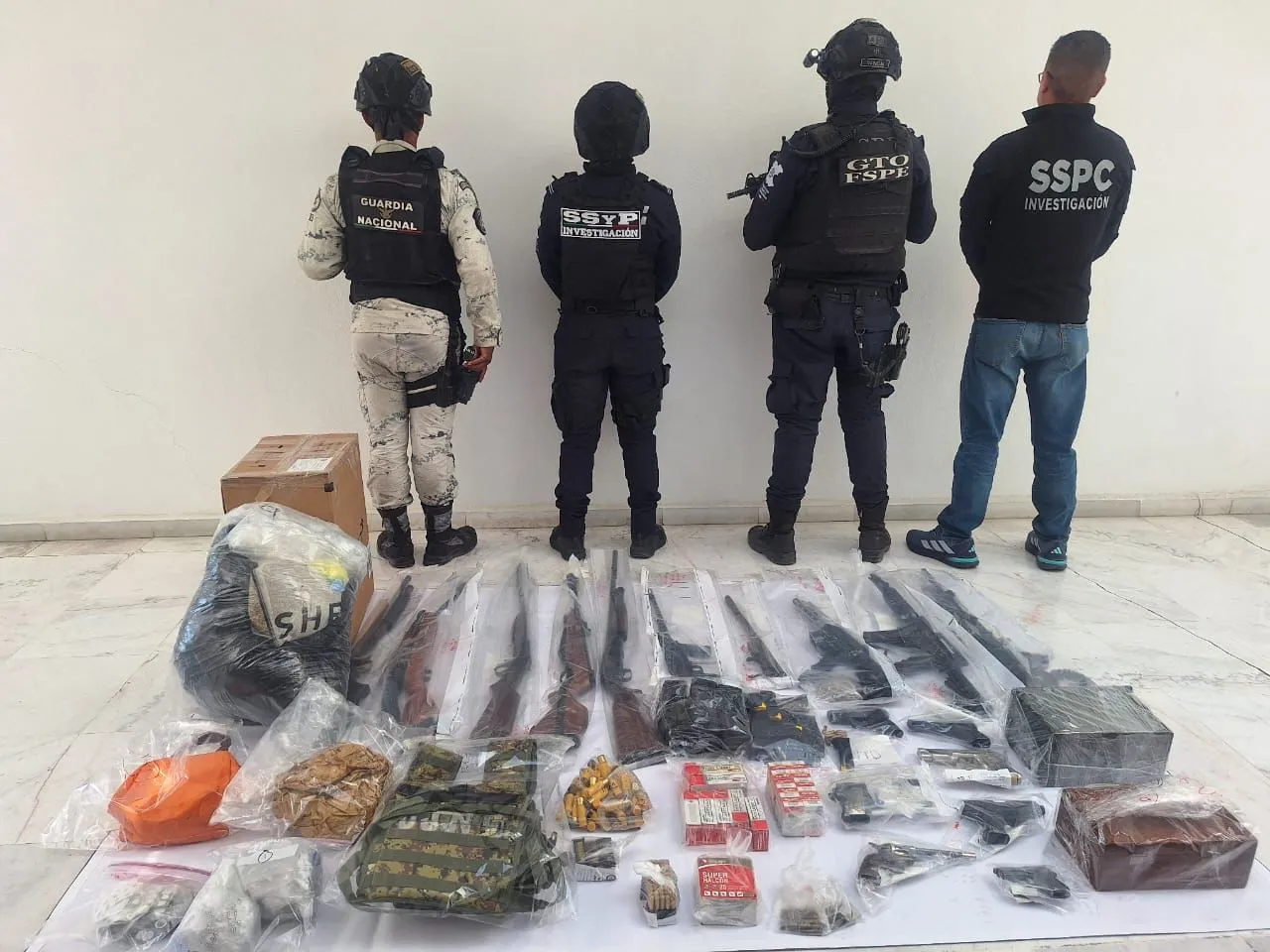 Por otro lado, en los inmuebles de la calle Volcán Jorullo fue detenido Arturo «N», de 46 años, presunto distribuidor de drogas e identificado como probable generador de violencia en los municipios de León, San Francisco del Rincón y Purísima del Rincón. En estos domicilios se incautaron nueve armas largas, seis armas cortas, cartuchos y cargadores de diversos calibres, así como equipo táctico que incluía chalecos y una gorra con leyendas de un grupo delictivo. También se confiscaron envoltorios con sustancias que aparentan ser cannabis y clorhidrato de metanfetamina.