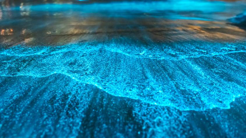Regularmente este tipo de reacción, se debe al estrés que se produce en el ser vivo. Cuando vemos luz en las olas es por la propia agitación que provocan los movimientos del agua que inducen a que se produzca esa reacción en el fitoplancton.
