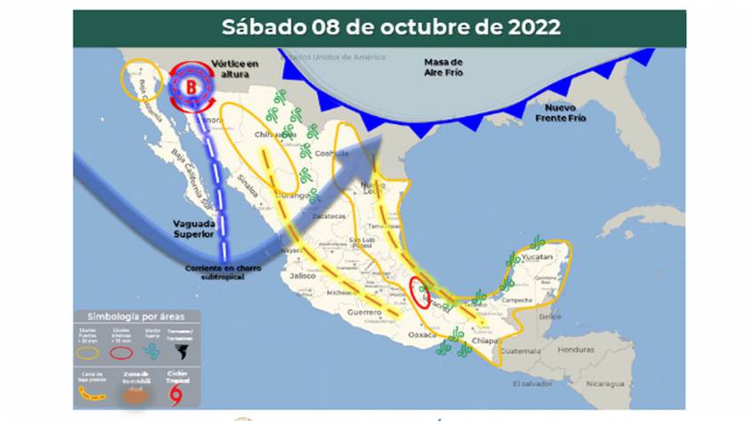 Se espera que este nuevo frente se extienda como estacionario sobre el norte y noreste de México y que ocasione chubascos y lluvias fuertes, con posible caída de granizo sobre estados del noroeste, norte y noreste.