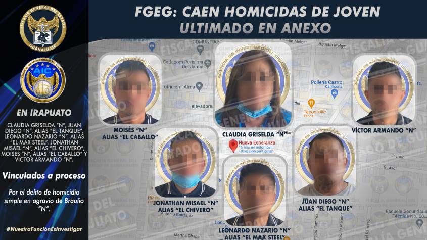 Los acusados CLAUDIA GRISELDA “N”, JUAN DIEGO “N”, alias “El Tanque”, – LEONARDO NAZARIO “N”, alias “El Max Steel”, JONATHAN MISAEL “N”, alias “El Chivero”, MOISES “N”, alias “El Caballo” y VICTOR ARMANDO “N”, fueron detenidos por agentes de Investigación Criminal, bajo cargos de homicidio simple.