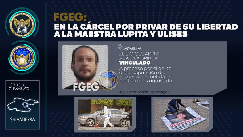 JULIO CÉSAR “N”, alias “La Gringa” fue detenido e imputado por el delito de desaparición de personas cometida por particulares en agravio de la profesora María Guadalupe “N” y Ulises “N”.