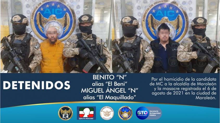 La Fiscalía guanajuatense dio a conocer que en un operativo conjunto con la Guardia Nacional, Ejército Mexicano y Policía Estatal, detuvieron a Benito “N” alias «El Beni» y a Miguel Ángel “N” alias » El Maquillado», presuntos integrantes del comando.