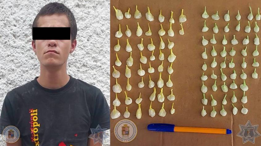 El sujeto, identificado como Miguel Ángel “N”, vestía de negro e intentó huir al notar la presencia policial, guardando una bolsa en su pantalón. Fue alcanzado y detenido en la calle Zeus. Tras una inspección, los elementos localizaron 101 dosis de la droga conocida como cristal.