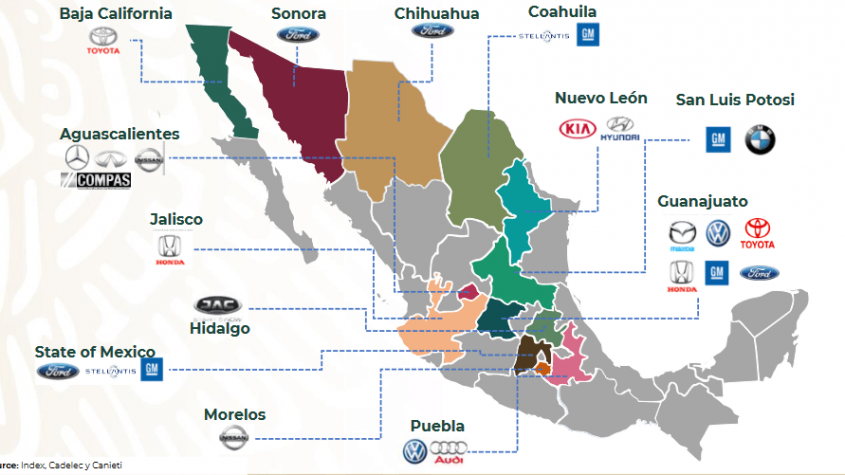 En México operan importantes armadoras de autos como General Motors en Coahuila y San Luis Potosí, Ford en Sonora y Estado de México, Volkswagen en Puebla, Audi en Puebla, Nissan en Aguascalientes y Morelos, Toyota en Guanajuato y Baja California, BMW en San Luis Potosí y Stellantis en Coahuila y Estado de México, entre otras. Estas empresas han convertido al país en un pilar clave para la industria automotriz global, gracias a su mano de obra calificada y costos competitivos.