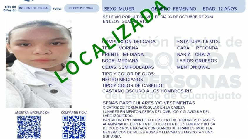 La menor había sido reportada como desaparecida desde la mañana del 3 de octubre, lo que activó los protocolos de búsqueda a través de redes sociales y de la Alerta Amber Guanajuato.