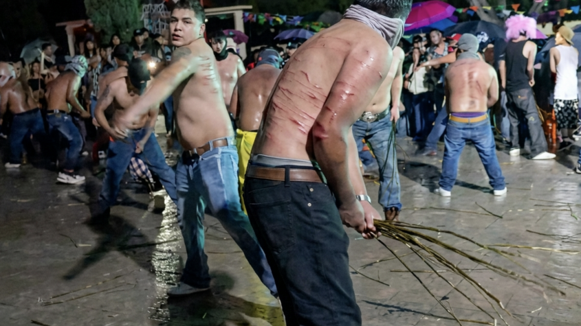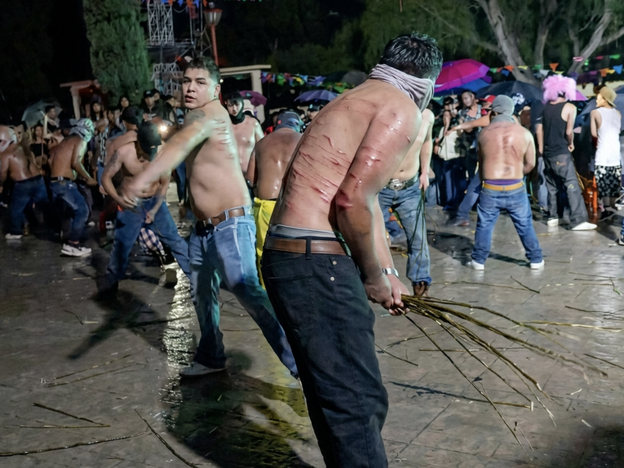 Uno de los momentos más impactantes ocurre durante la noche, cuando hombres de la comunidad realizan danzas rituales que culminan con actos de flagelación. Utilizando varas de membrillo, los participantes se azotan la espalda hasta provocar heridas visibles, en un acto que, aseguran, tiene un profundo significado espiritual.