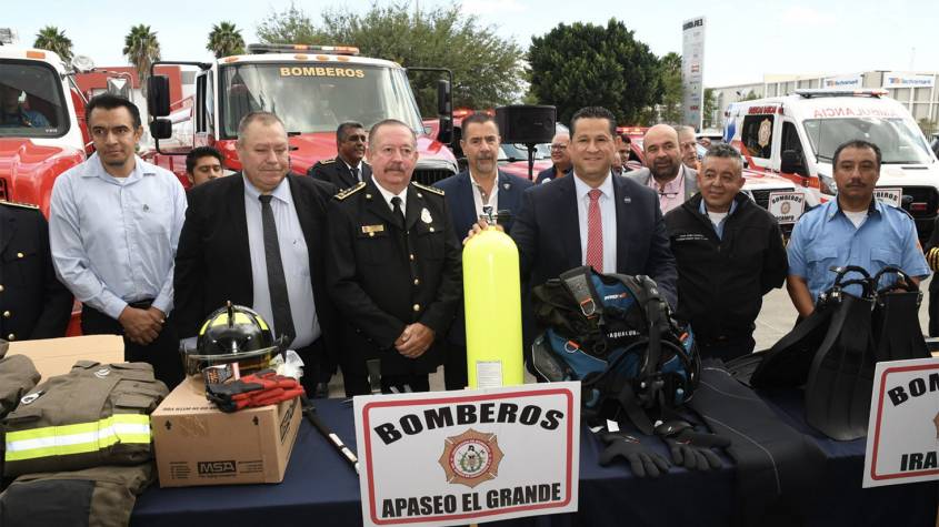 El Gobernador entregó un cheque por 16.4 millones de pesos a Juan Antonio Quiroga Lozano, presidente de la Asociación de Bomberos, provenientes del Programa de Engomados, además de 15.1 millones de pesos en equipamiento. Este equipamiento incluye unidades motobomba, camiones cisterna, ambulancias, escaleras y equipo de protección personal, que serán distribuidos en los municipios de Abasolo, Apaseo el Grande, Cuerámaro, Doctor Mora, Irapuato, Salamanca, Uriangato, Valle de Santiago, entre otros.