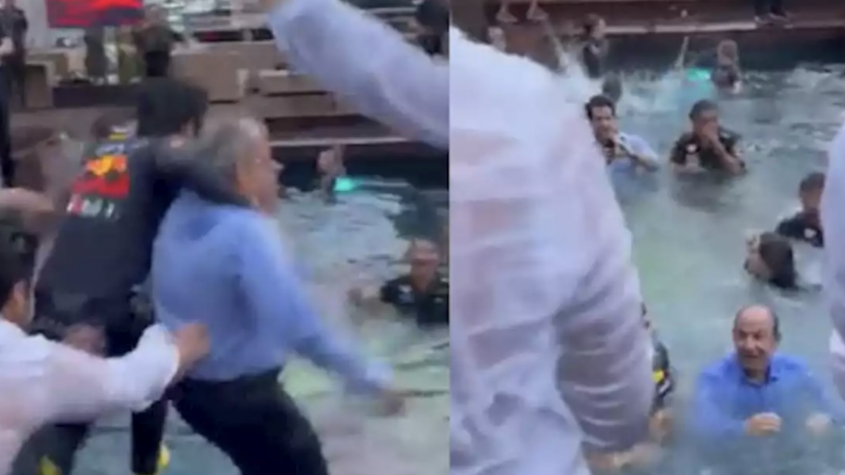 El expresidente emanado del PAN, Felipe Calderón, tomado del hombro junto con el piloto mexicano Checo Pérez, se lanzaronn a la alberca con el apoyo de otros espectadores que estaban disfrutando de la fiesta.