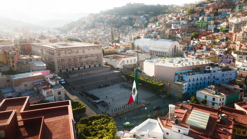 Autoridades del municipio de Guanajuato y la Guardia Nacional celebraron el 108° aniversario de la Constitución Política de México con una ceremonia de izamiento de la Bandera en la explanada de la Alhóndiga de Granaditas.