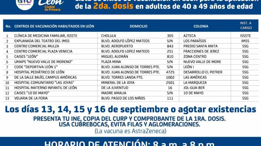 El día de hoy ha comenzado la aplicación de la segunda dosis de la vacuna AstraZeneca para personas de 40 a 49 años en los municipios de León, San Francisco del Rincón, Salamanca, Abasolo, San Miguel de Allende, San Felipe, Pénjamo, Dolores Hidalgo y Valle de Santiago.