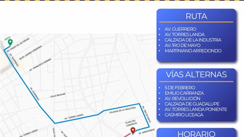 El recorrido iniciará en la intersección de las avenidas Guerrero y Paseo de las Fresas, en la colonia Jardines de Irapuato, y seguirá sobre la avenida Guerrero hasta incorporarse a la avenida Torres Landa en dirección a la Calzada de la Industria. Posteriormente, el contingente avanzará por la avenida Primero de Mayo y concluirá en la calle Martiniano Arredondo, dentro de la Plaza del Comercio Popular, donde se lleva a cabo la feria del Alfeñique.