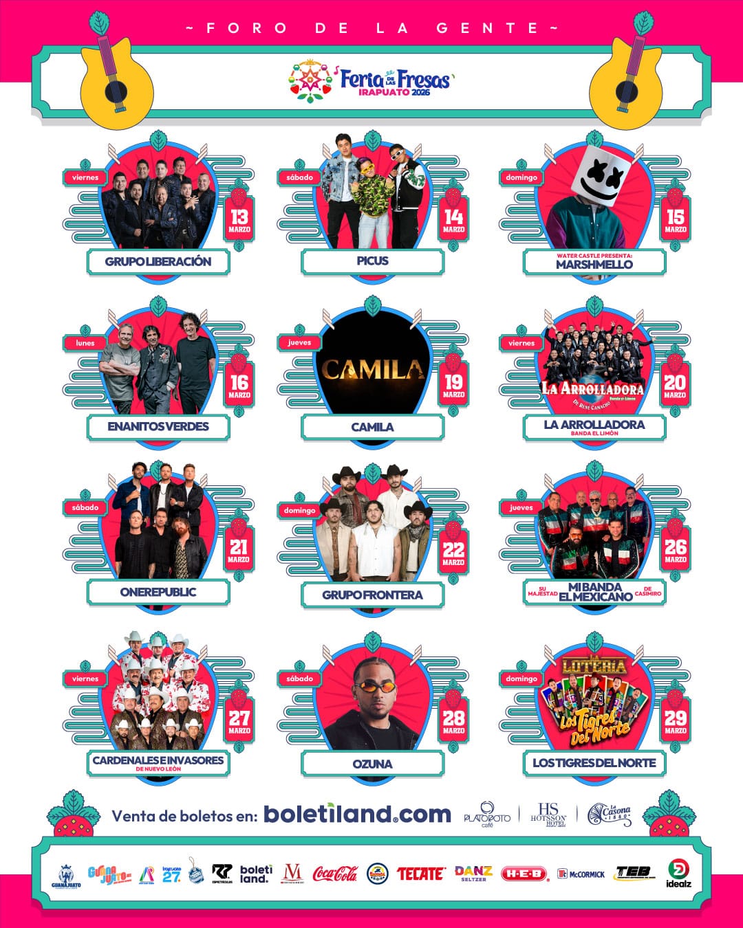 Con un elenco artístico de talla nacional e internacional encabezado por Los Tigres del Norte, OneRepublic, Marshmello, Ozuna, Grupo Frontera y La Arrolladora Banda El Limón, entre otros, la Feria de las Fresas 2026 de Irapuato se perfila como uno de los eventos de entretenimiento más importantes del país. Los artistas se presentarán en el Foro de la Gente, espacio principal de esta celebración.