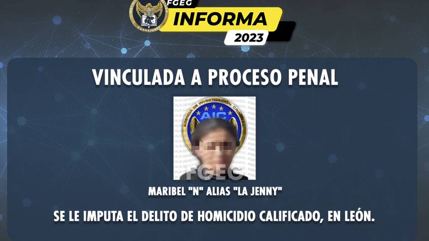 La Fiscalía General del Estado obtuvo una orden de aprehensión para la captura de “La Jenny”, quien fue llevada a audiencia, donde el Ministerio Público logró que fuera vinculada a proceso penal por homicidio calificado en agravio de Oscar Alejandro “N” y José Guadalupe “N”.