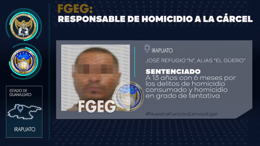 JOSÉ REFUGIO “N”, alias “El Güero” ha sido sentenciado a 13 años con 6 meses de cárcel, por los delitos de homicidio y tentativa de homicidio, en hechos ocurridos en un autolavado ubicado en Paseo Solidaridad, esquina con avenida del Jilguero en la colonia Ciudad de los Olivos, en Irapuato.