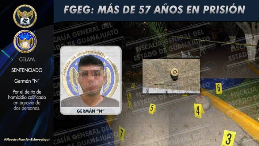Un hombre ha sido sentenciado a pasar 57 años con 6 meses de cárcel tras ser encontrado culpable de asesinar a dos hombres hace 5 años en Celaya. GERMÁN “N”, deberá pagar también la reparación del daño a las víctimas indirectas de su conducta criminal por más de 700 mil pesos.