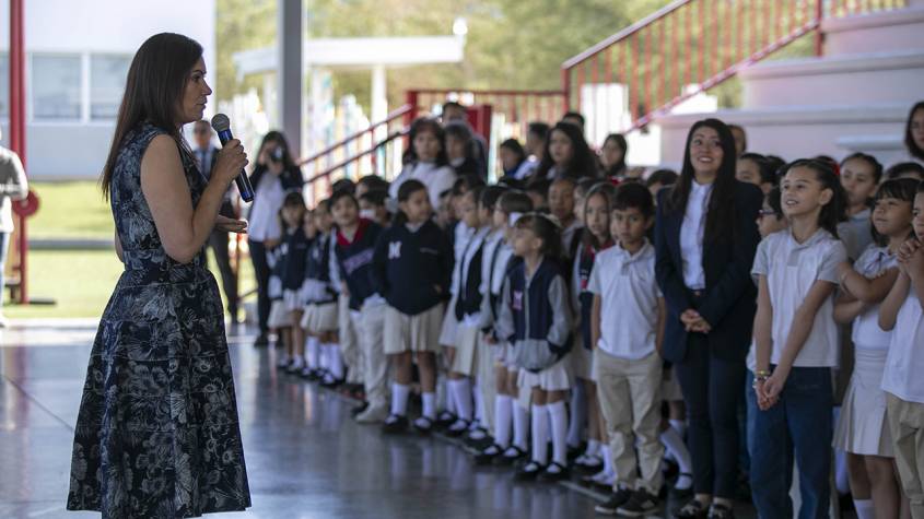 Durante la ceremonia de Honores a la Bandera en el Colegio Monclair, la presidenta municipal motivó a los alumnos a luchar por sus sueños y contribuir al bienestar de su comunidad.