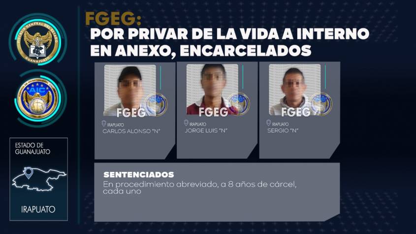 En una actuación de procedimiento abreviado, tres sujetos fueron sentenciados a 8 años de cárcel por el delito de homicidio simple. Los acusados golpearon a un hombre que se encontraba interno en un anexo de la calle Casimiro Chowell, en la colonia Playa Azul en Irapuato.