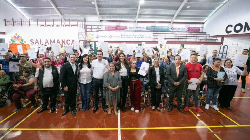 «Hoy muchas familias pueden decir que su patrimonio está seguro. Este documento les da certeza sobre su hogar», destacó García Muñoz Ledo. Además, entregó al Municipio de Salamanca las escrituras de un terreno que será destinado a un área de donación.