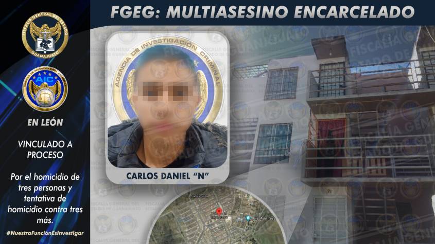 Se logró identificar a uno de los intervinientes en el multihomicidio y una vez confirmada su identidad, la Fiscalía General del Estado logró ubicar y detener a CARLOS DANIEL “N”. En audiencia inicial, este sujeto fue puesto en prisión de manera cautelar, al iniciar el Ministerio Público una investigación formalizada en su contra.