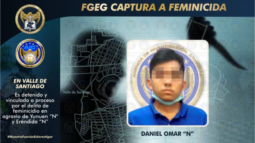 La Fiscalía General del Estado ubicó a sanguinario sujeto que acuchilló a dos mujeres de 24 y 19 años en la colonia El Socorro, el pasado 22 de octubre. El hombre de 22 años, identificado como DANIEL OMAR “N”, fue imputado por el delito de feminicidio y vinculado a proceso penal, con cárcel como medida cautelar.