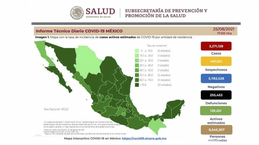 El número de contagios también aumento considerablemente y a pesar de no ser un pico máximo, si es un número importante con 21,250 nuevos casos contagiados y que ya dan un total de 3 millones 271 mil casos.