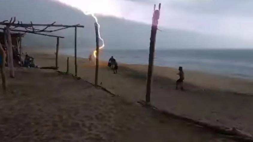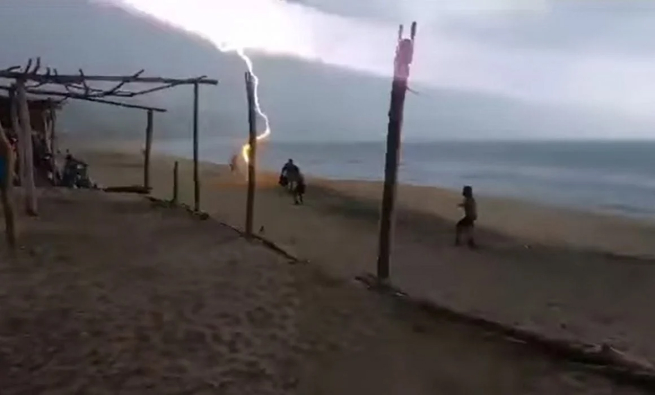 Un video ampliamente compartido en las redes sociales muestra cómo varias personas corren para refugiarse de la playa, pero lamentablemente dos individuos son alcanzados por un rayo que los golpea y los hace caer al suelo.