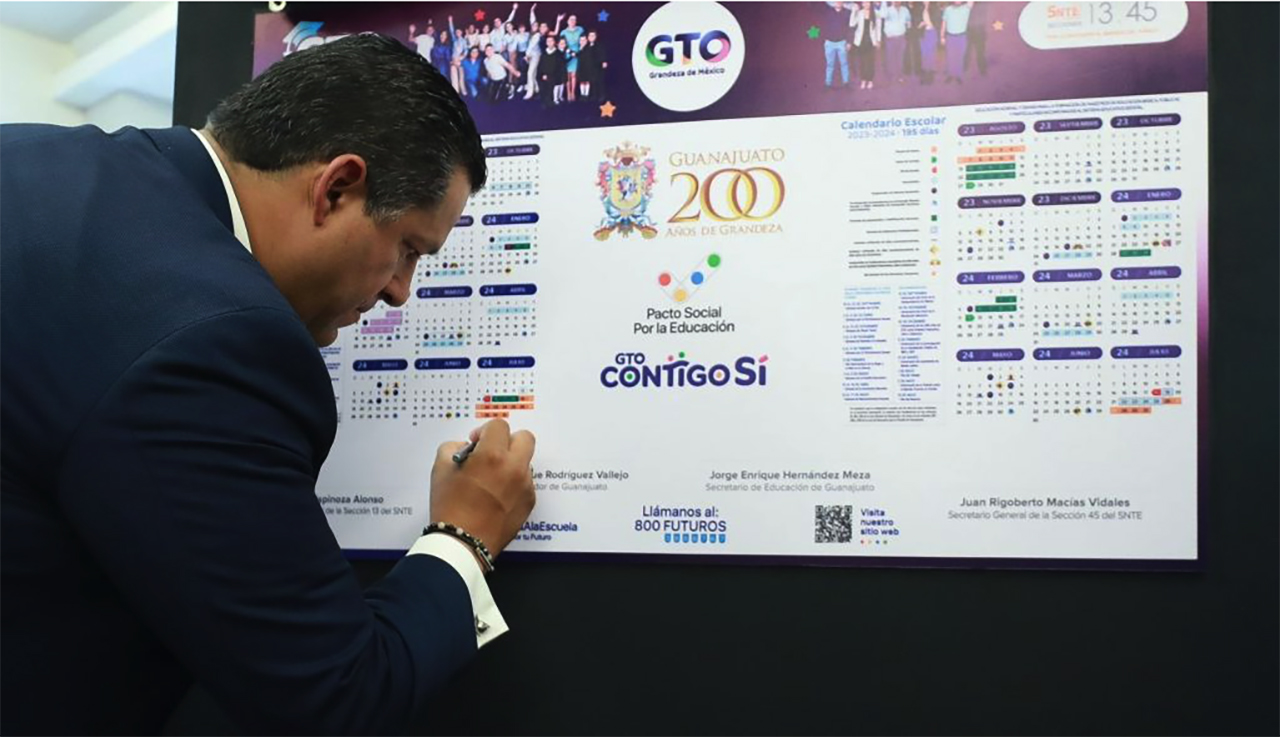 «Quiero expresar mi felicitación a la Secretaría de Educación y a las secciones 13 y 45 del Sindicato Nacional de Trabajadores de la Educación por este trabajo conjunto. Es un logro sin igual a nivel nacional, esta firma de calendario sienta un precedente que merece ser seguido y preservado en esta misma línea», afirmó el Gobernador del Estado, Diego Sinhue Rodríguez Vallejo, durante la ceremonia de ratificación del Calendario Escolar correspondiente al Ciclo 2023-2024. Este calendario estipula 190 días de labor para las escuelas tanto públicas como privadas en el Estado de Guanajuato, y 195 días para las instituciones formadoras de docentes.