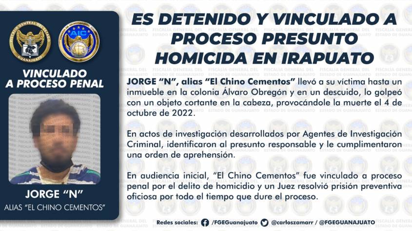Presunto homicida de Irapuato es detenido y vinculado a proceso.