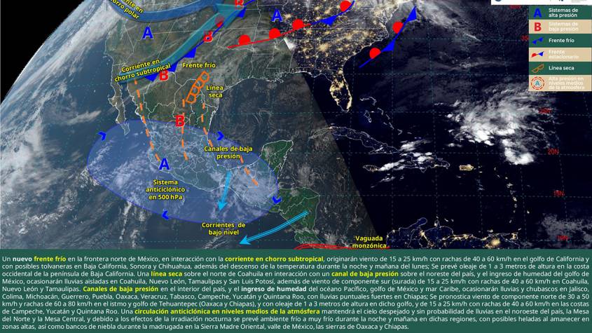 Conagua advirtió que el frente frío generará intervalos de chubascos en estados como Campeche, Chiapas, Oaxaca, Nuevo León, Veracruz, Yucatán y Tamaulipas. Por otro lado, se esperan lluvias aisladas en Colima, Michoacán, Puebla, Tabasco, San Luis Potosí y Guerrero.