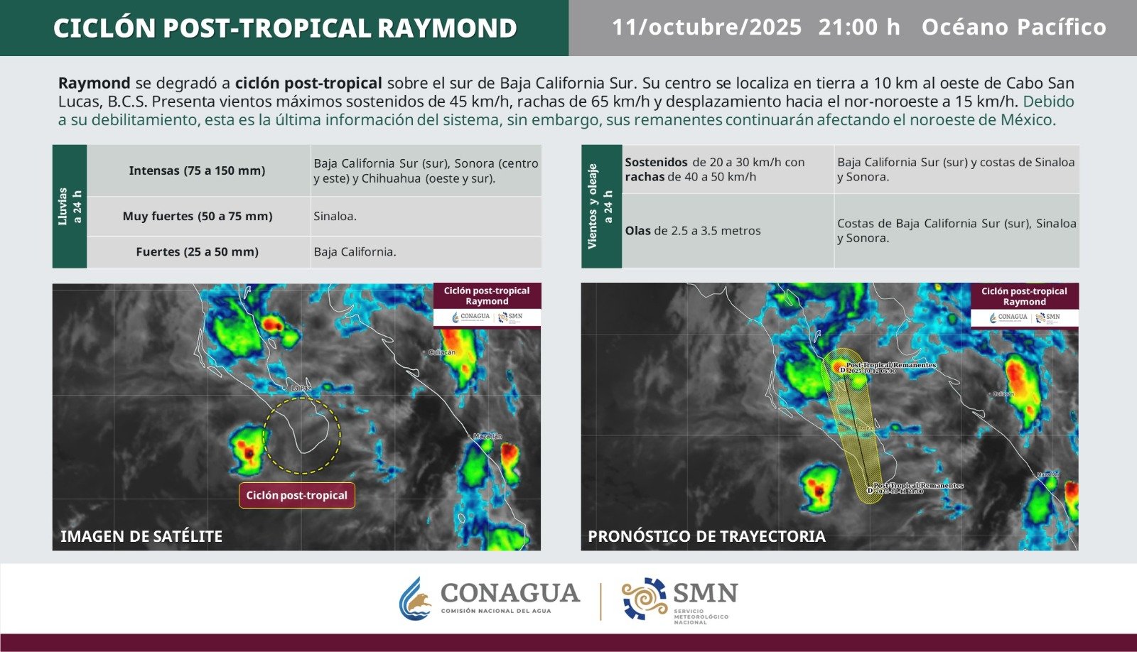 De acuerdo con el último reporte de la Comisión Nacional del Agua (Conagua), a las 21:15 horas Raymond se degradó a ciclón post-tropical, aunque sus remanentes continúan provocando lluvias intensas, vientos fuertes y oleaje elevado en varias regiones.