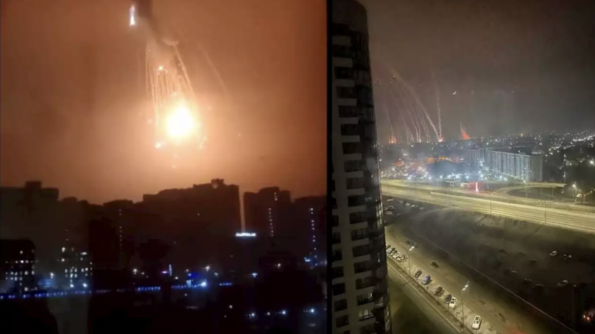 Alrededor de las 4:25 horas (las 8:25 pm horas tiempo de México) se escucharon fuertes explosiones en la capital, las cuales se difundieron en todo el mundo. Minutos después, usuarios de redes sociales reportaron la caída de escombros en fuego, de lo que podría ser una aeronave o un misil, presumiblemente interceptado por el equipo antiaéreo de Ucrania.