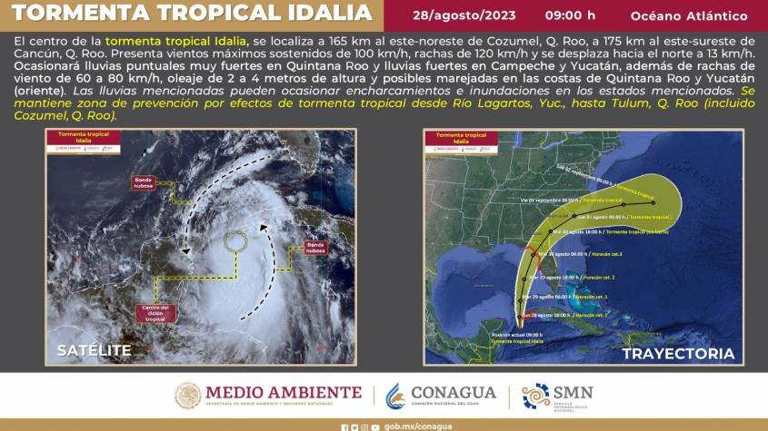 Los vientos máximos sostenidos de «Idalia» alcanzan los 100 km/h, con ráfagas de viento de hasta 120 km/h. Se espera que el día de hoy, lunes, la tormenta tropical se intensifique y alcance la categoría 1 de huracán cuando se encuentre a 180 kilómetros al este de Cancún, Quintana Roo.