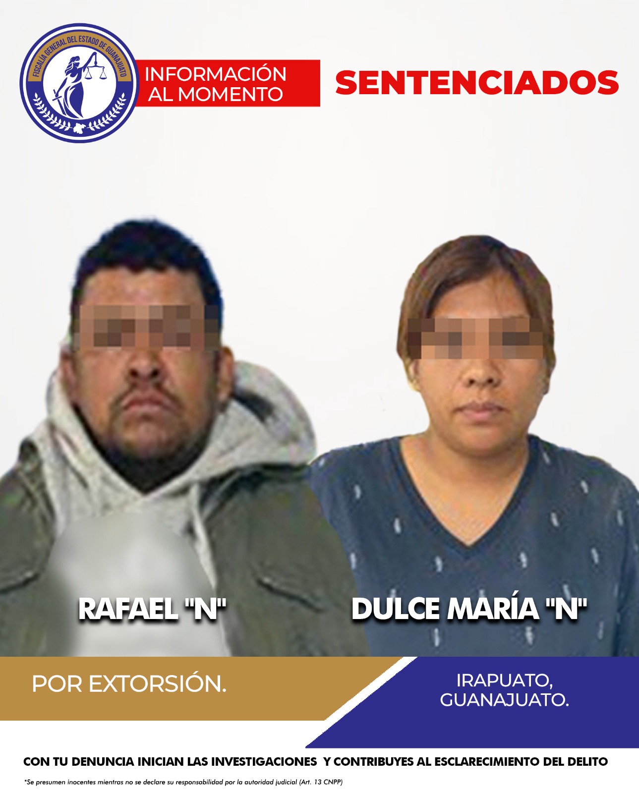 La Fiscalía General del Estado, a través de la Unidad de Combate a la Extorsión de la Fiscalía Especializada en Investigación de Delitos de Alto Impacto (FEDAI), logró que dos extorsionadores recibieran sentencia por el delito de extorsión agravada en el municipio de Irapuato.
