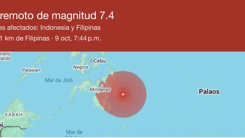 Un sismo de magnitud 7.4 se registró la mañana de este jueves 9 de octubre en el sur de Filipinas, de acuerdo con el Servicio Geológico de Estados Unidos (USGS). El movimiento, ocurrido en altamar, provocó la activación de alertas de tsunami para varias provincias costeras del país.