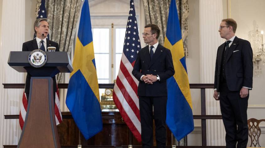 La decisión de unirse a la OTAN fue motivada principalmente por la invasión rusa a Ucrania. En palabras del secretario de Estado estadounidense, Antony Blinken, «las cosas buenas ocurren a aquellos que esperan». El primer ministro sueco, Ulf Kristersson, entregó los documentos de adhesión durante la ceremonia, destacando que esta medida es una «victoria para la libertad».