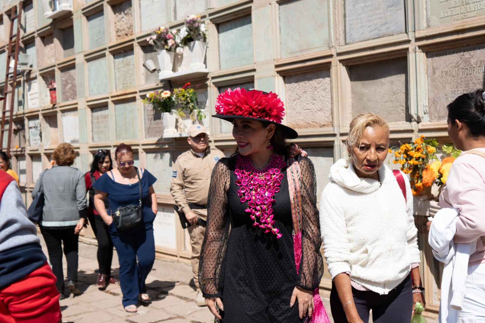 Acompañada por elementos de la Secretaría de Seguridad Ciudadana, la alcaldesa recorrió los panteones Santa Paulay Virgen de la Luz, conocido también como Panteón Nuevo, donde constató la presencia de personal de Policía Preventiva, Protección Civil y Tránsito Municipal, así como el funcionamiento de los dispositivos de vigilancia y control de acceso.