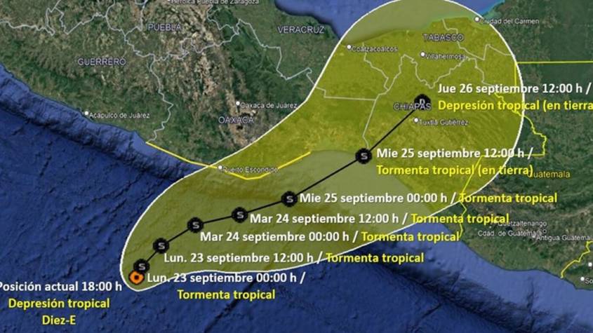 Además, se pronostican vientos con rachas de 70 a 90 km/h y oleaje de hasta 4 metros en las costas de Oaxaca, así como vientos de 40 a 60 km/h y oleaje de 1 a 3 metros en las costas de Guerrero y Chiapas.