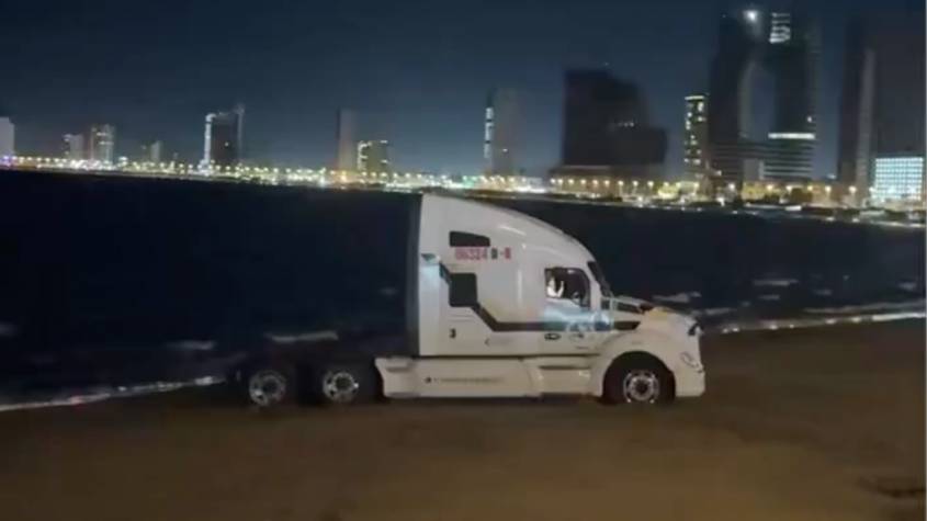 Un tráiler quedó atorado en la arena de Playa Norte, en el puerto de Mazatlán, Sinaloa, la noche del martes 21 de enero, luego de que el conductor ingresara a una zona de playa donde está restringido el acceso vehicular.